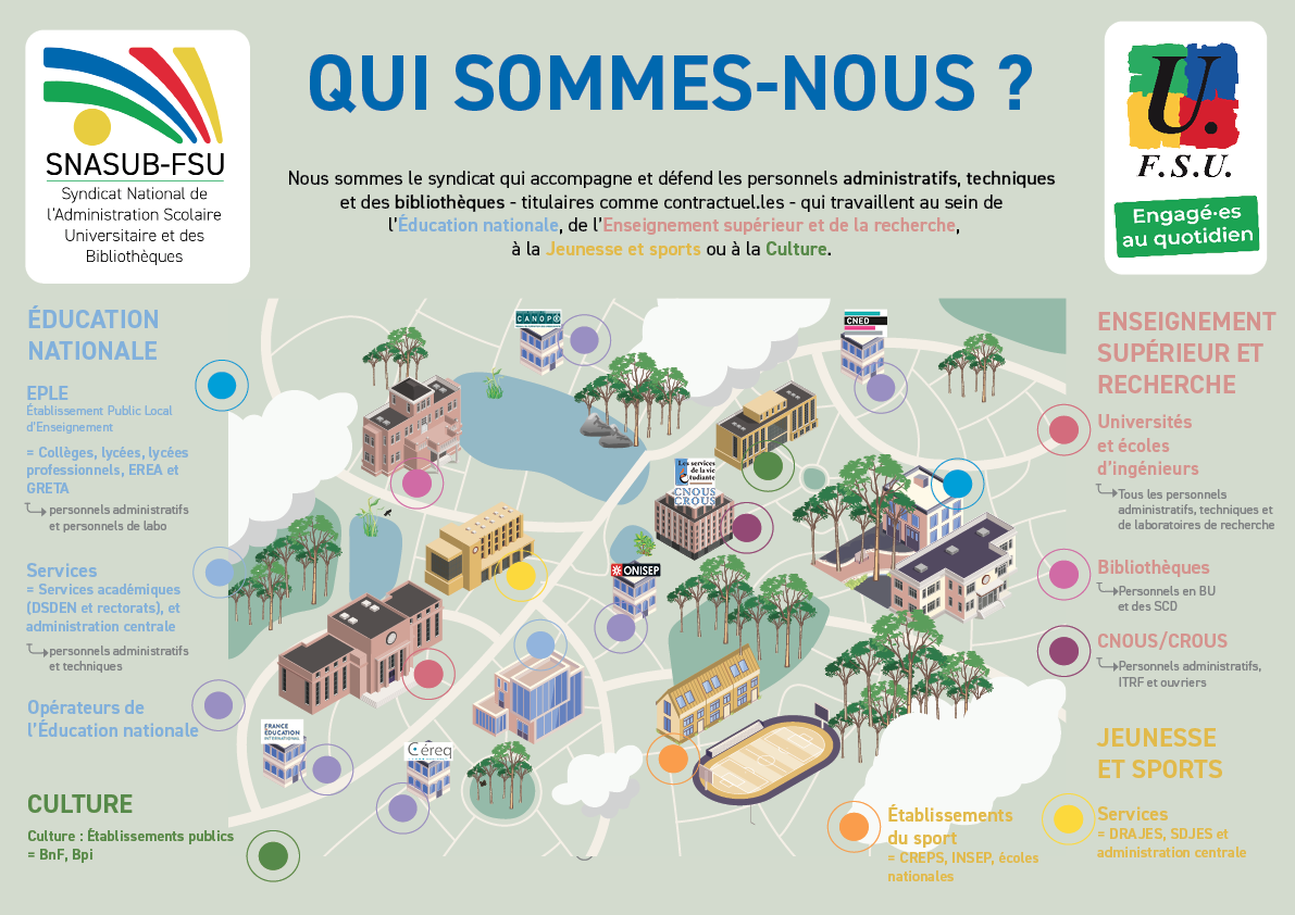 Le SNASUB-FSU est le syndicat national qui représente tous les personnels – titulaires et contractuels – qui travaillent au sein de l’Éducation nationale, de l’Enseignement supérieur et de la recherche, à la Jeunesse et sport et à la culture. Le SNASUB-FSU est membre de la Fédération Syndicale Unitaire (FSU), première force syndicale dans le secteur de l’éducation.
